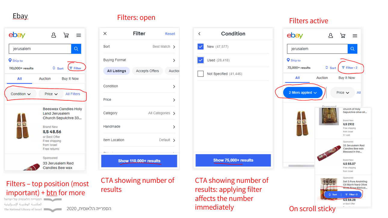 Filters position and behavior – Ebay and Amazon probably have a good reason for placing filters in scrollable strips (my assumption: provides greater discoverability).
